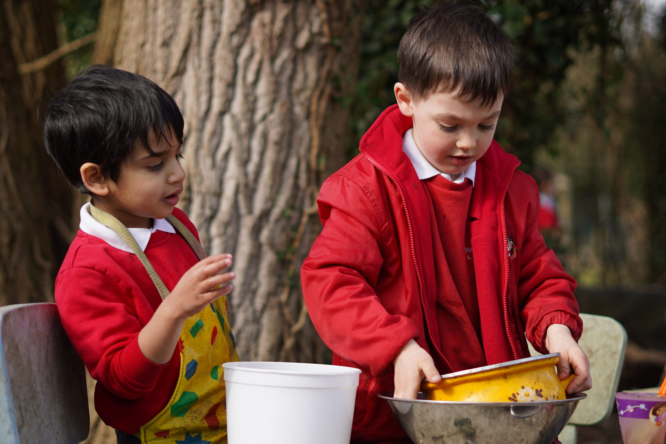 Two young boys in school uniform wearing yellow aprons while playing with pots outside on the playground